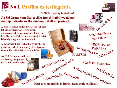 Hát nem csodálatos? Van egy parfümöm, ami koncentrációjában, minőségében megegyezik az eredetivel,ugyanabból az alapanyagokól készül, hiszen egy gyár állítja elő mindkettőt, azonban csak 3620Ft-ba kerül! Merthogy, az FM Parfümöknek egységes ára van, minden egyes parfüm 3620Ft. Természetesen vannak új extra minőségű fejlesztések kicsit drágábban de még mindig a nagy nevű márkák árai alatt. És a különbséget garantáltan nem veszik észre. A cég sikerességét mi sem bizonyítja jobban, minthogy a 3 év alatt egész Európában és Amerikában annyira elterjedt, hogy a nagy parfüm forgalmazó láncok (pl. Douglas) aggódni kezdtek, és jelentős bevétel kiesésről számoltak be. Hiszen a hatás ugyanaz, a parfüm illata kellemes, olyan mint a márkás parfümnek, tartóssága szintén, hiszen ugyanabból a gyárból jön, egyvalami azonban MÁS!